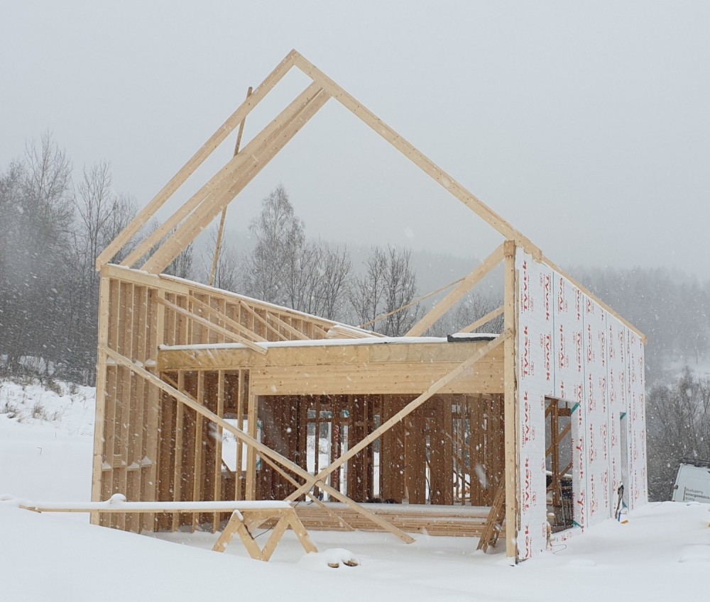 Tak, budowa domu szkieletowego zimą jest możliwa i nasza firma regularnie od wielu lat w okresie zimy wznosi konstrukcje szkieletowe domów. Istotne jest zastosowanie materiałów odpornych na niskie temperatury oraz wilgoć. Samej stawianej konstrukcji zabezpieczyć się nie da, ale nasze prace idą szybko i w krótkim czasie dom jest od zewnątrz zabezpieczony folia wiatroizolacyjną, a na dachu mamy membranę dachową.